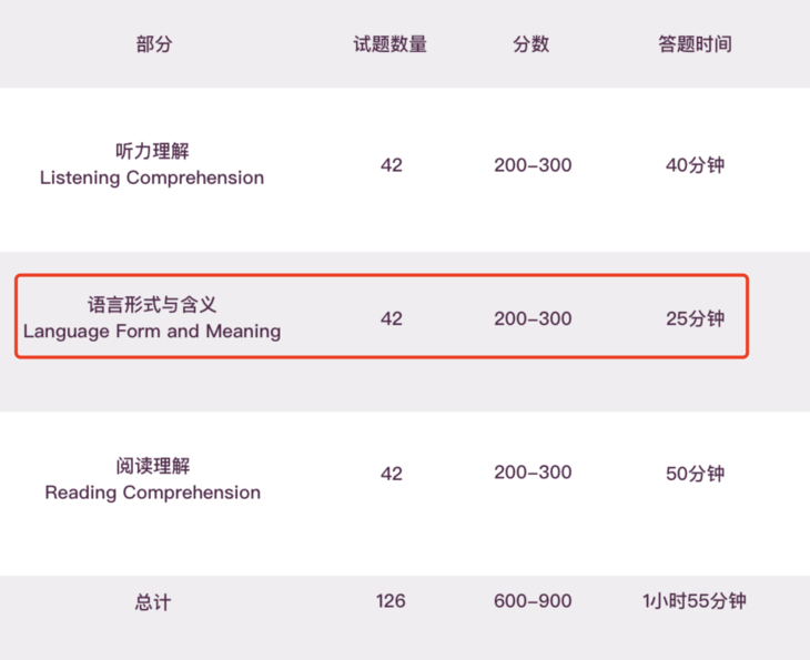 而且【语言形式和含义】这一块还不是考几个选择题这种,它的题目数量和分数占比和整个听力理解模块、整个阅读理解模块是一样的。
