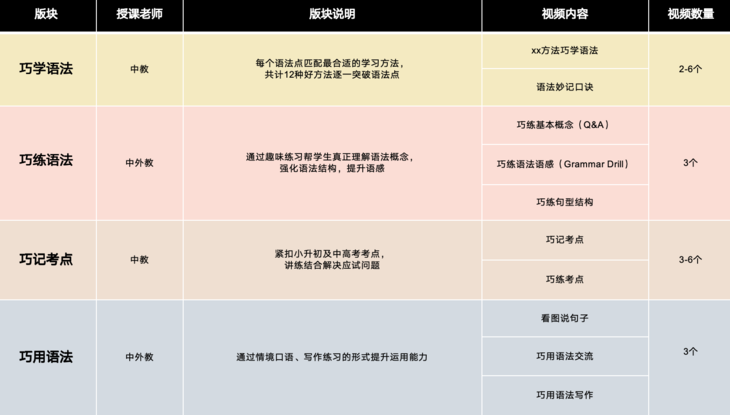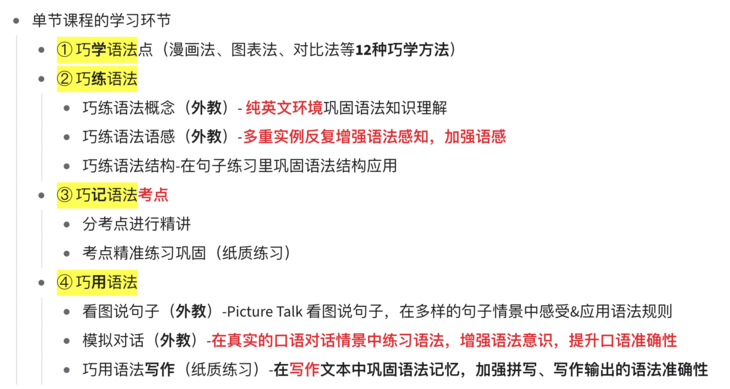 每一节课都由『巧学语法』『巧练语法』『巧记考点』『巧用语法』四个大的模块组合,每个模块里还有细分的学习和练习环节。