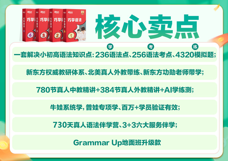 同时这一套新东方的语法课程是市面上少有能够系统解决小学、初中、高中阶段所有语法知识点的课程~
