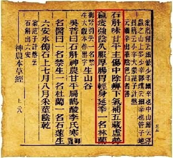 《神农本草经》记载:“石斛主补五脏,安精神,定魂魄,止惊悸,除邪气,明目,开心益智。久服,轻身延年。”