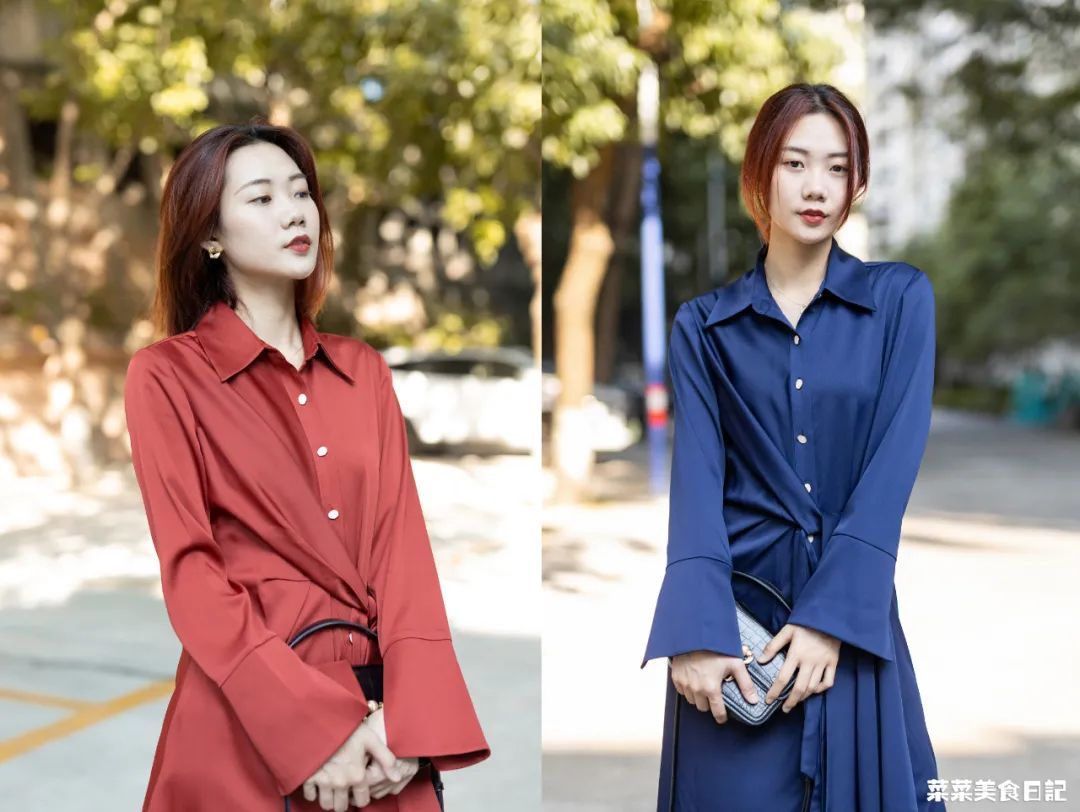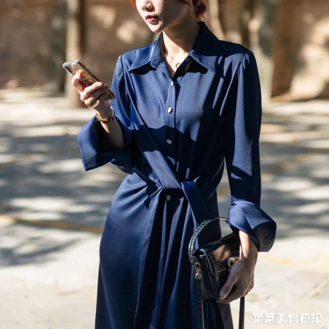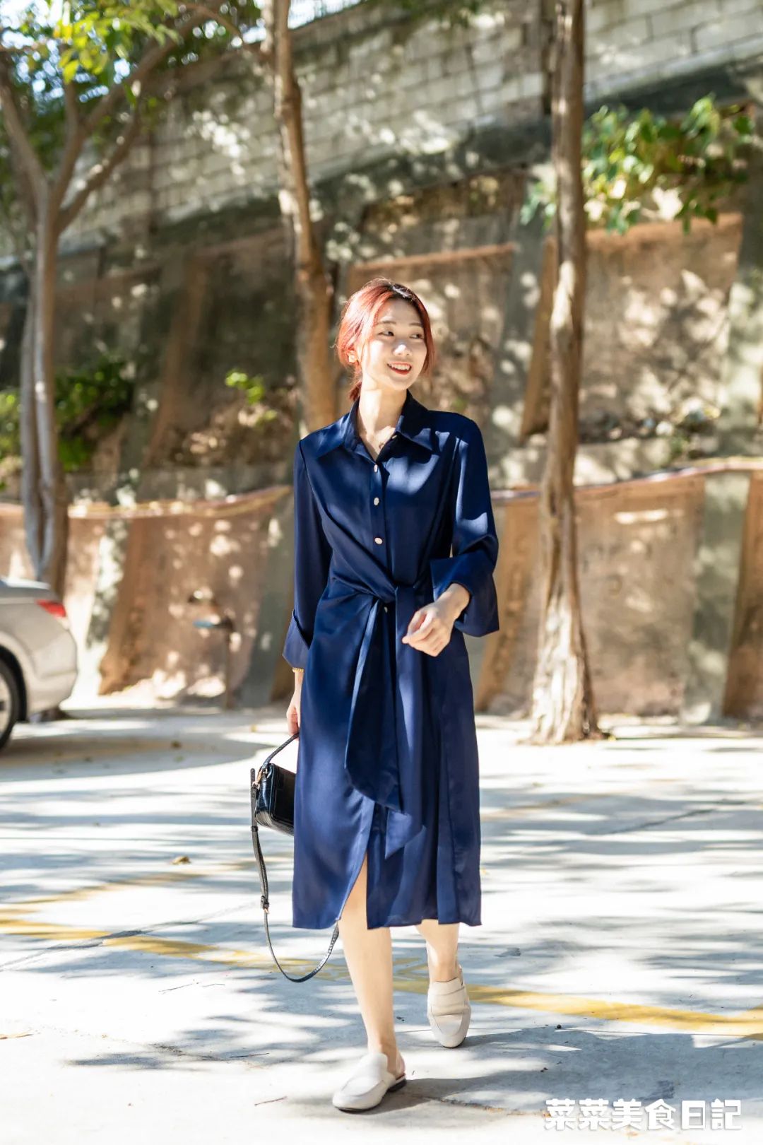 好看的衬衫裙很多,但要耐穿、耐看、好打理的,菜菜推荐这一条:仿醋酸绑带衬衫裙
