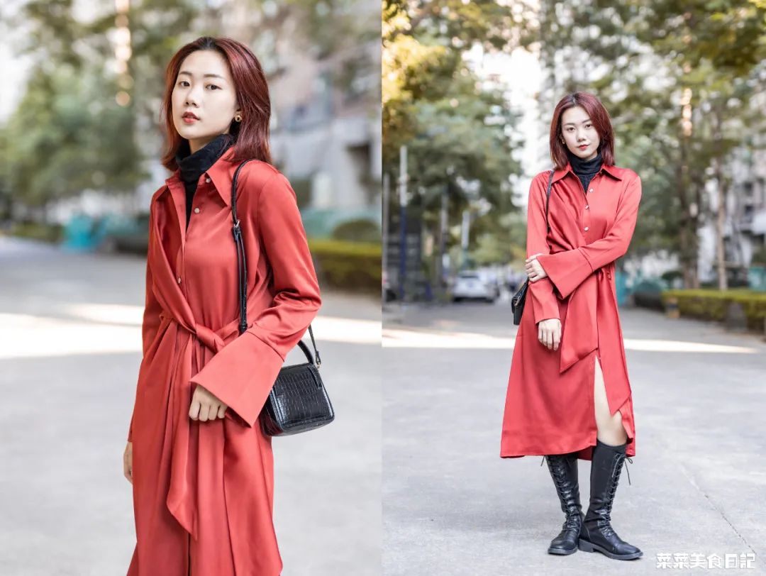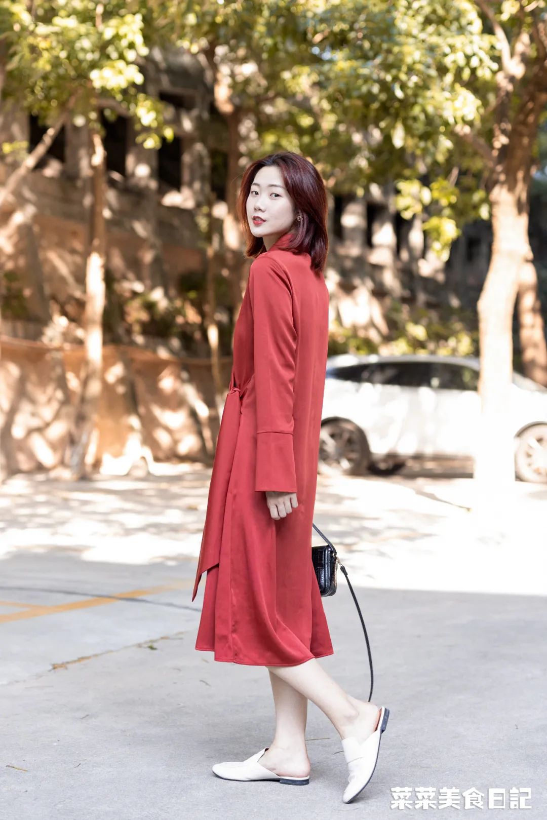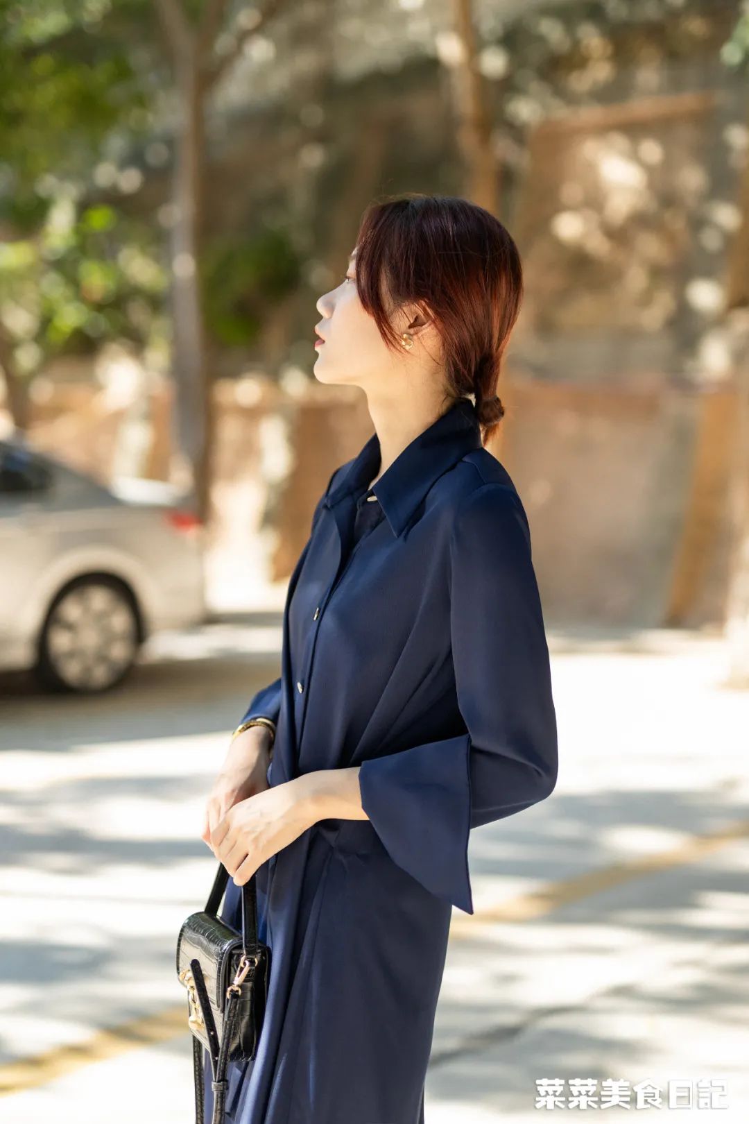 好看的衬衫裙很多,但要耐穿、耐看、好打理的,菜菜推荐这一条:仿醋酸绑带衬衫裙
