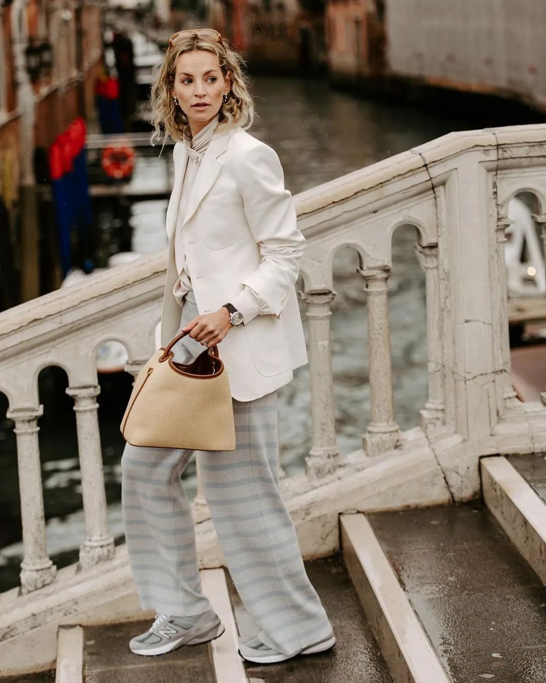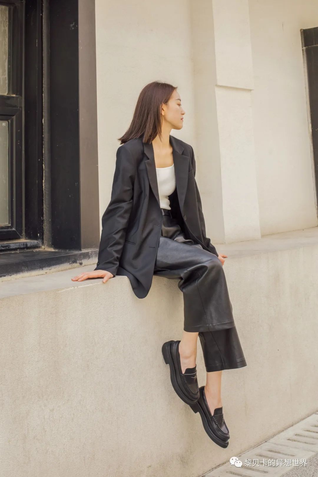 喜欢穿厚底鞋的朋友,可以照抄她这个穿搭公式:运动鞋+阔腿裤+西装外套~▼