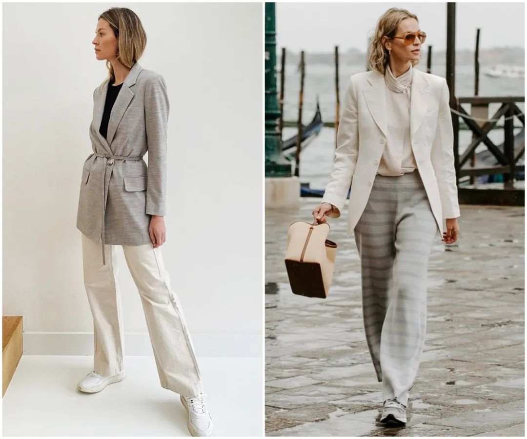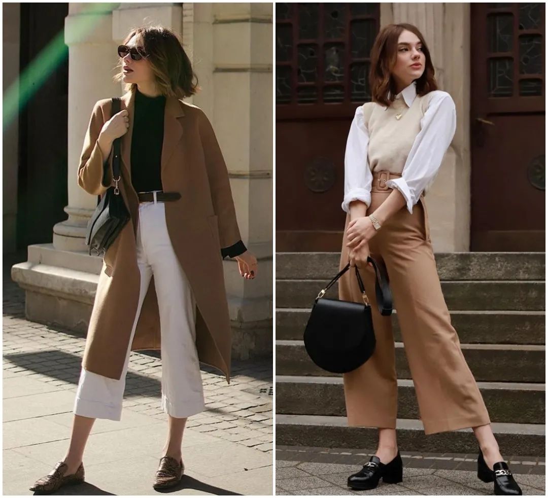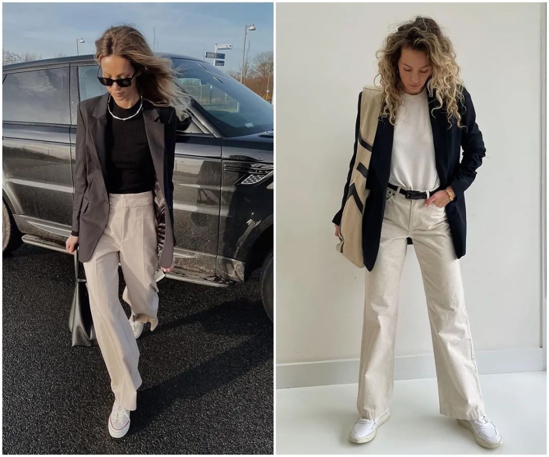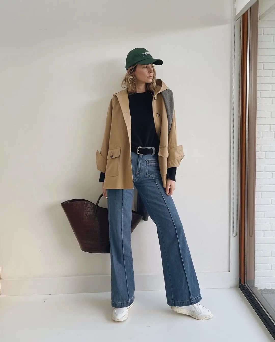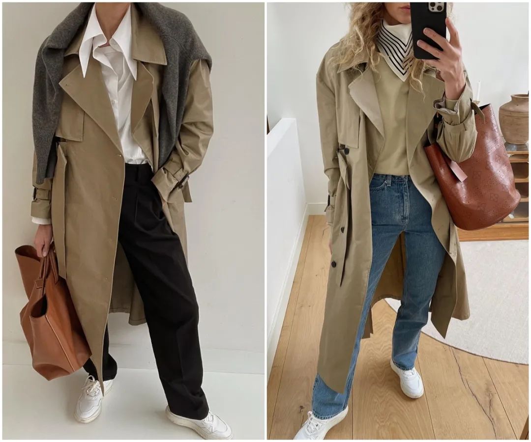 同样的单品,她总能穿出新意。拿小白鞋来说,上班用风衣搭配阔腿裤(左),周末把下装换成牛仔裤(右),轻松实现两种风格切换。▼