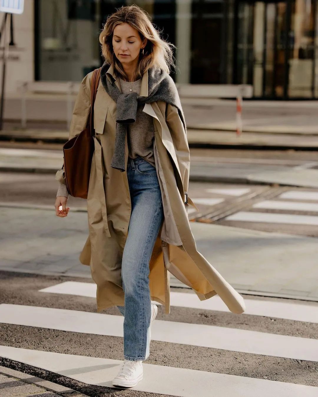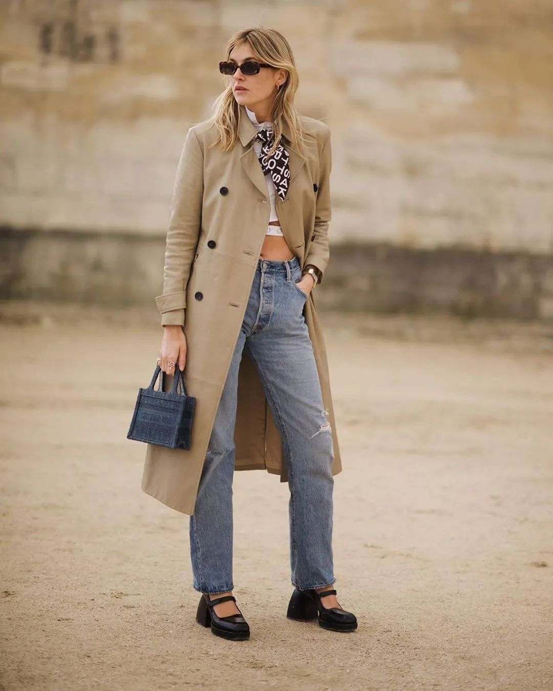 帆布鞋和风衣也是黄金搭档,能加持风衣的文艺感。她这一身看着很轻松,适合周末~▼
