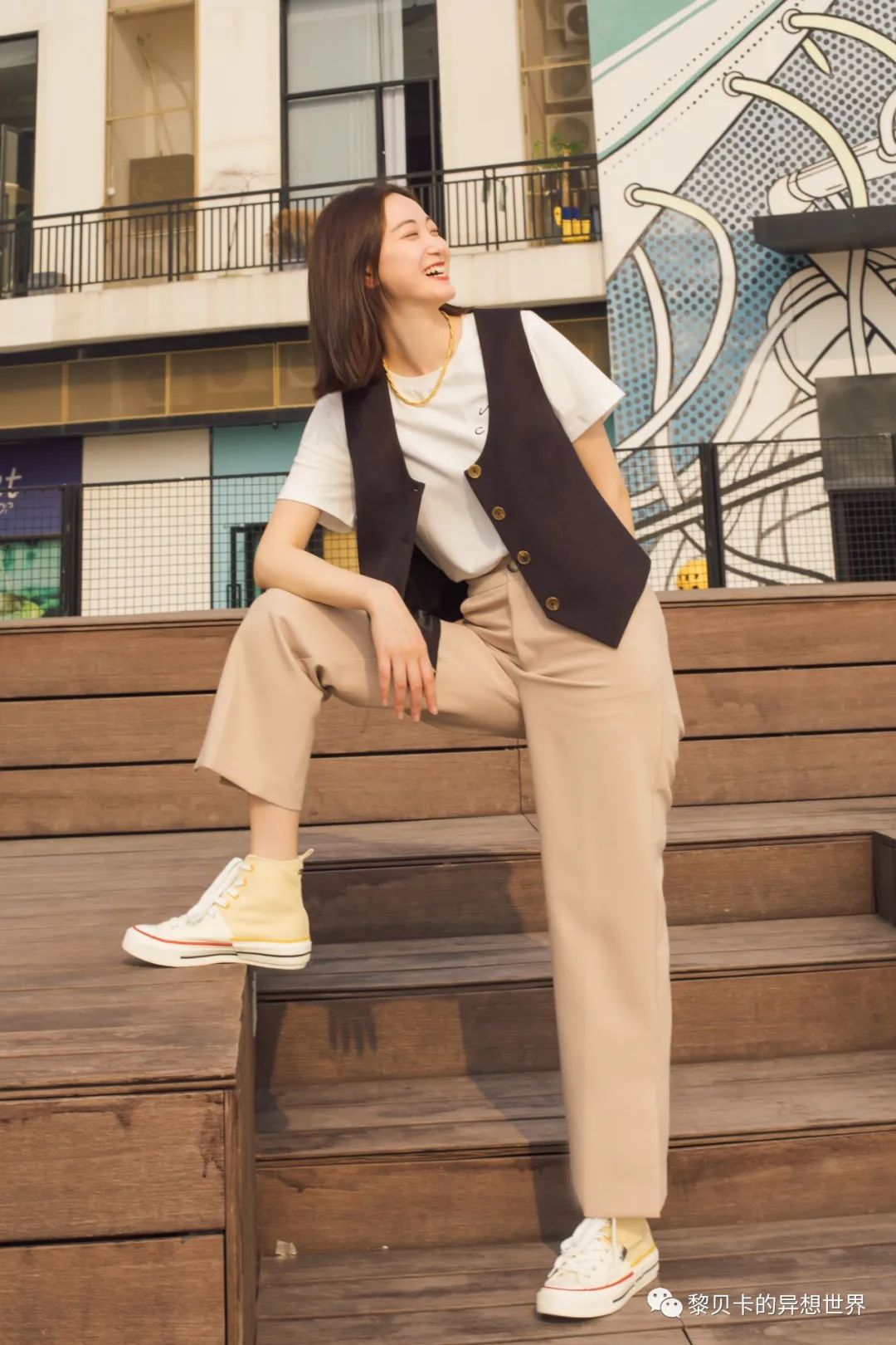 最近她喜欢“宠幸”一双米色高帮帆布鞋,搭配长裤,可以延长下身比例。▼