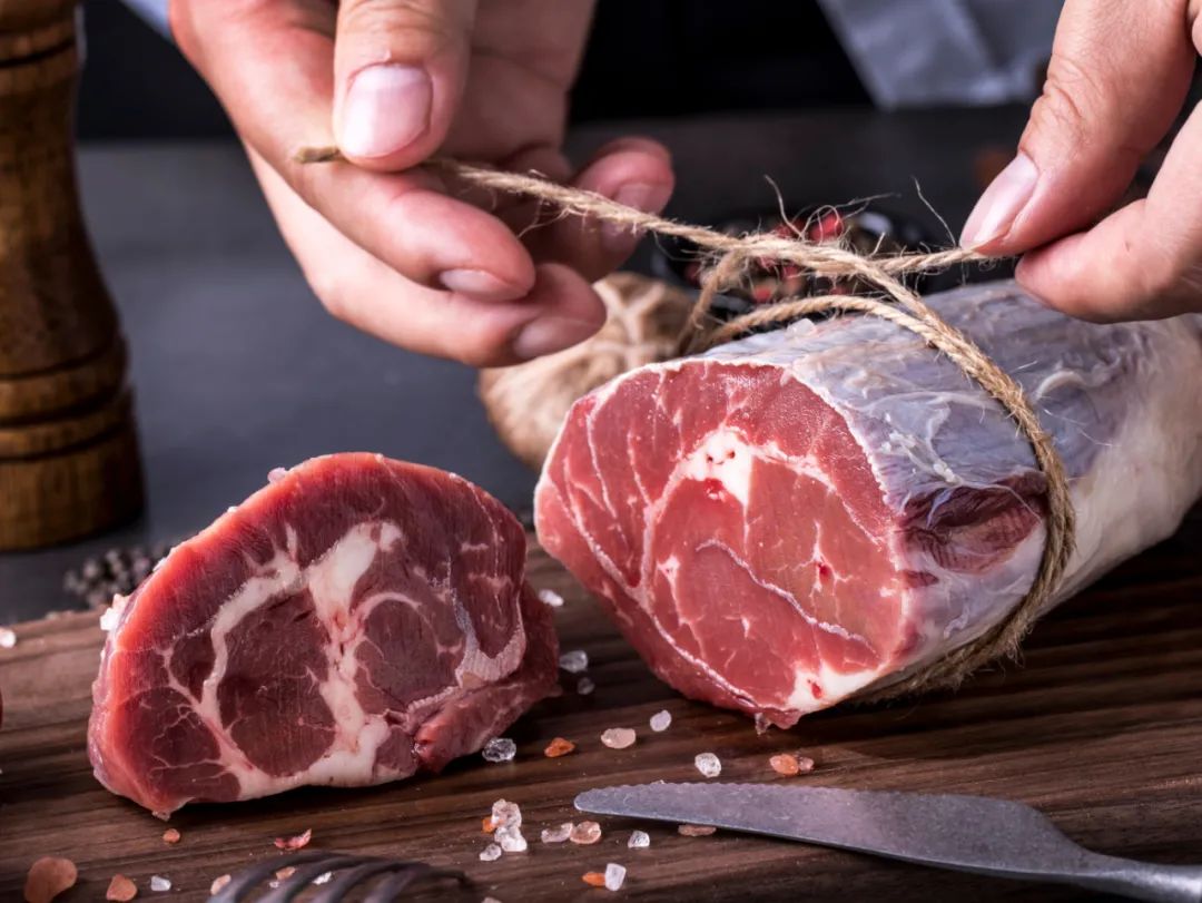 8.裹上一层保鲜膜,放在冰箱2个小时后切开,冷缩了的牛肉紧密夯实。