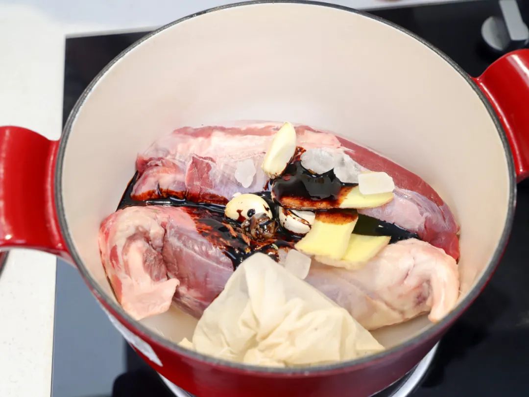 2.锅内依次放入腱子心,生姜,冰糖,大蒜以及香料包