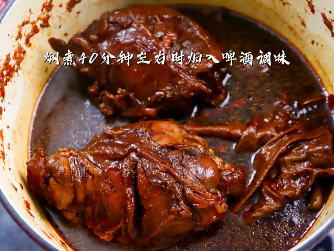 6.这里有个小诀窍: 焖煮40分钟左右加入啤酒调味会更香
