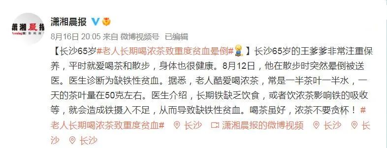 近日一则新闻引起关注:长沙一位65岁老人因长期喝浓茶致重度贫血,在散步时突然晕倒被送医。据悉,老人酷爱喝浓茶。