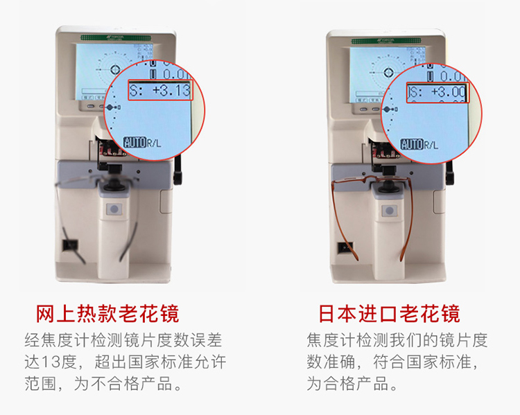 有人会担心度数准不准的问题。经焦度计检测,其他网上热款老花镜,度数误差超出国家标准允许范围;镜品堂老花镜,做工严谨,度数精准,符合国家标准!不愧是60年老牌,十分让人安心!