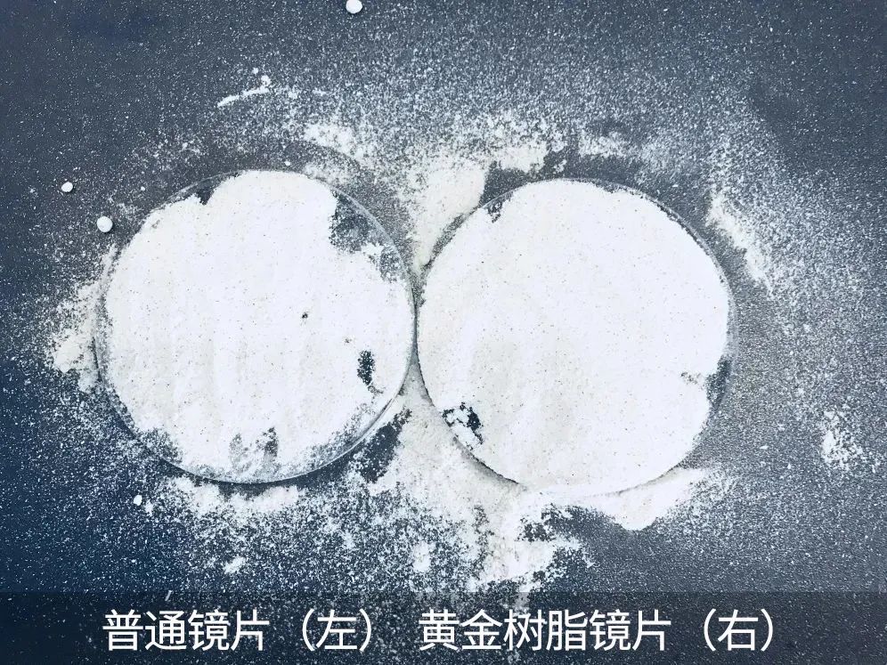 ✅最后,是防灰尘测试对比!在两种镜片上撒上奶粉,将奶粉抖落,可以看到普通镜片依旧粘有奶粉,而黄金树脂镜片基本看不到!