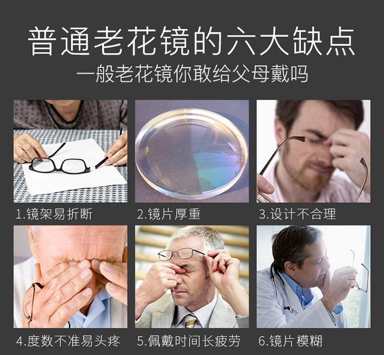 为了省钱,他们舍不得去配好的眼镜,随便在路边摊上买副5块10块的老花镜就戴了。殊不知,劣质眼镜镜片透光性差、不防蓝光、不过滤强光,导致视力严重下降,眼睛越来越花!