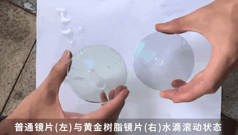 ✅然后,是防水性测试!普通镜片上很容易附着水滴,而在黄金树脂镜片上的水滴,可以在镜面上随意滚动,镜面没有附着任何水渍!所以非常好清洁~