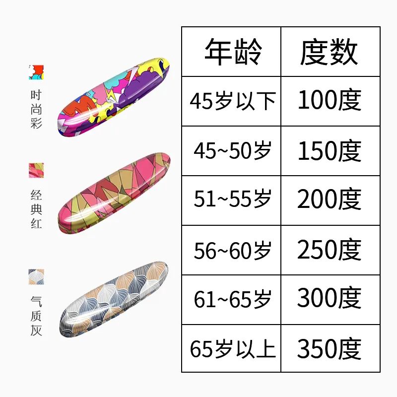 度数从100度~350度,可以按照个人实际度数选择,不知道度数的也可以按照年龄选!