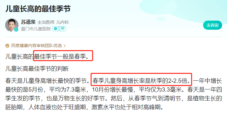 据世界卫生组织的一项研究表明,春季对于儿童来说,身高增长值是秋冬季的2-2.5倍。