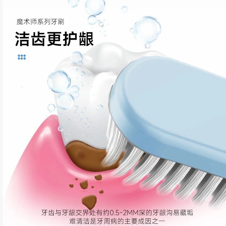 魔术师团队经长期以来的调查研究,设计出宽头软毛牙刷,柔软舒适,高效清洁。