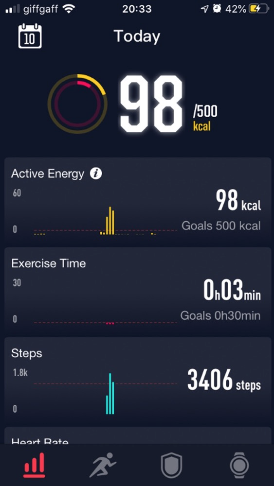 是用户当日的所有信息。包括行走步数、消耗卡路里、睡眠时间、心率变化。下拉屏幕还可以看到用户的静息心率、最大摄氧量、乳酸阈值心率和乳酸阈值配速。还有用户的健康等级。这些都是根据用户过往训练的强度以及心率来分析的。这对用户对自己身体状况的判断有很大的帮助。