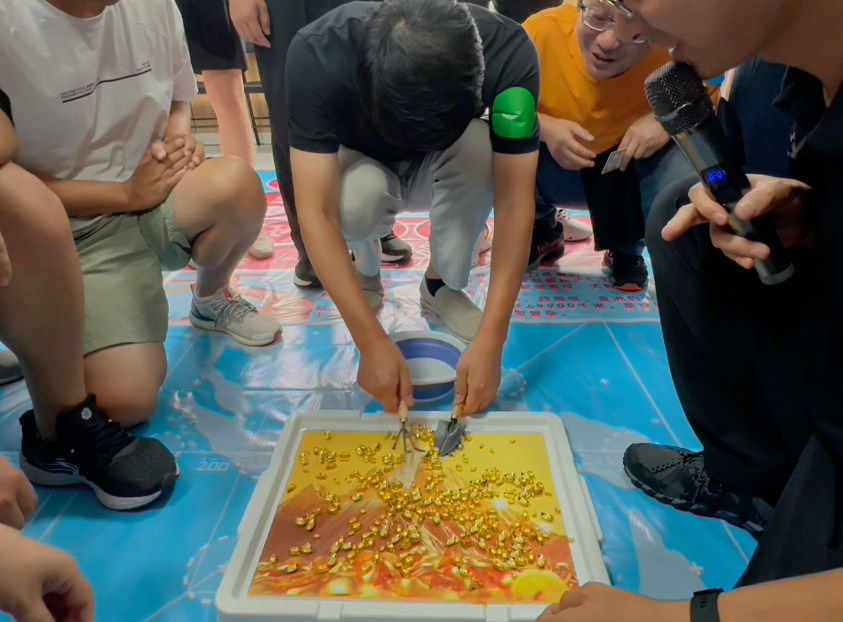 游戏介绍:每组选派 1 人蒙眼,60 秒内在指定区域借助工具取 “金块” 道具放入容器,比拼数量,全员围观呐喊助力,财富寓意拉满,轻松点燃年会喜庆氛围~