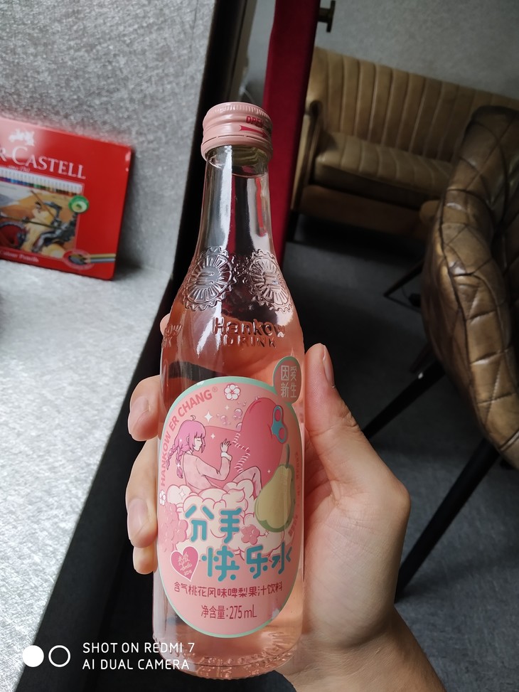 特别之处:主要是分手汽水,它的“小心机”之处在于 低温状态下,瓶贴梨子上能看到一句原创的情话哦!可以多买几瓶自己去摸索噢,颜值口味集一身的汽水拍照也很合适 真的很惊喜汉口二厂的这个新品汽水。