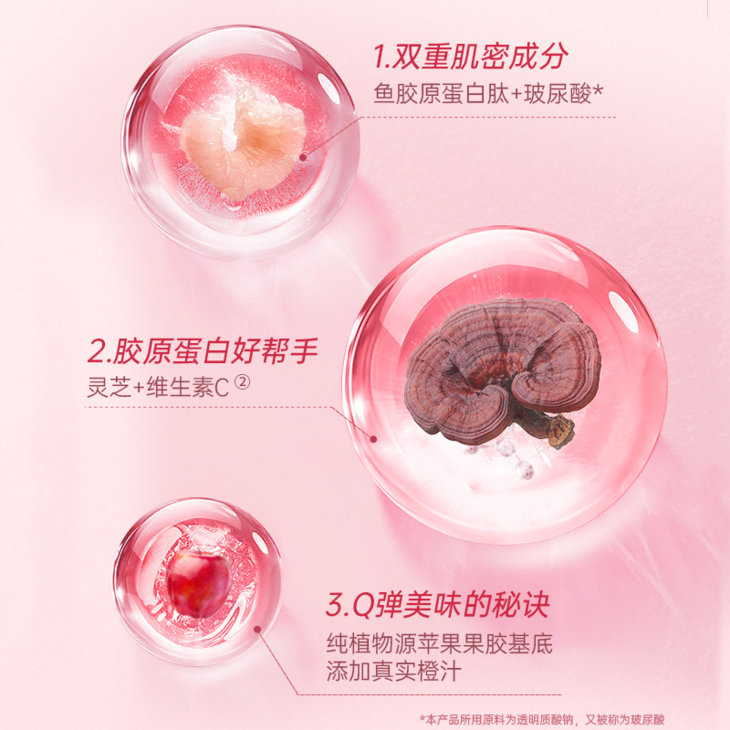 同时复配添加灵芝和VC,能促进胶原蛋白合成。0添加蔗糖,每粒热量约等于1/5个橙子。以100g/个的橙子为例,每粒软糖能量值为28.76kJ,约等于14g橙子的能量值,则约为1/5个。
