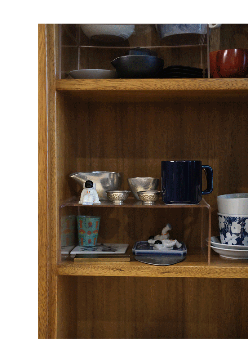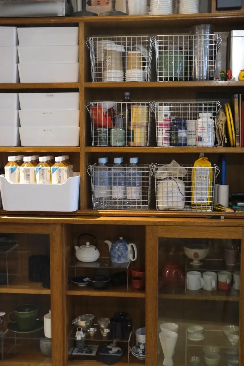 厨房里的大件小件满满当当地凑齐了生活气息,这里是她在家的另一片新天地。餐边柜里装着从不同地方淘来的餐具,“这只是很小一部分,还有很多放在日本没有运回来。”