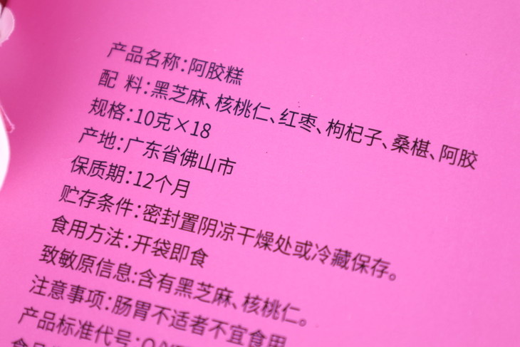 每一块「阿胶糕」的阿胶含量都高达10%以上,再配以黑芝麻、核桃仁、红枣、枸杞子、桑椹,采用无黄酒配方,以枸杞桑椹浓缩液熬膏,不额外添加糖,不额外添加黄酒,药食原料熬制!