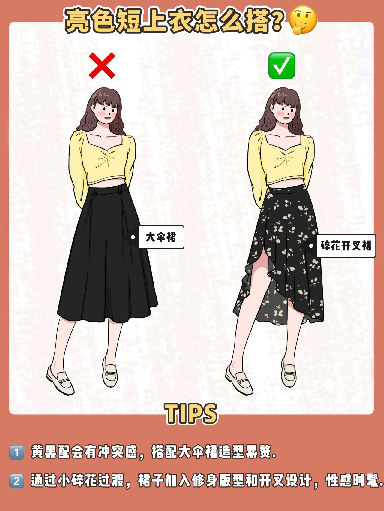 可以在裙子里加入小碎花、开叉、修身版型等女人味元素,来中和配色问题。
