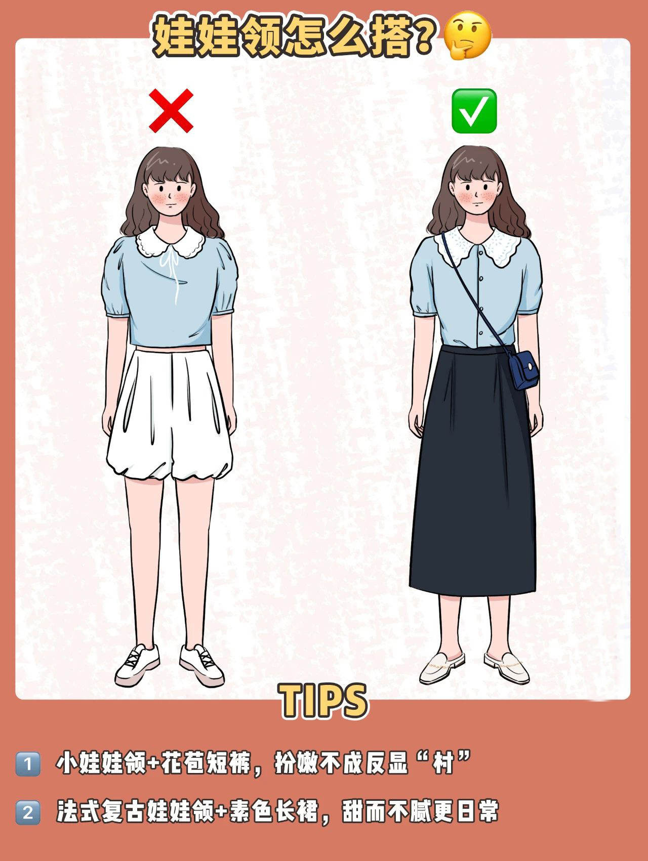 想要把娃娃领上衣穿出女神的感觉,可以配一条素色干净的裙子,打造复古文艺小清新风,甜而不腻哦~