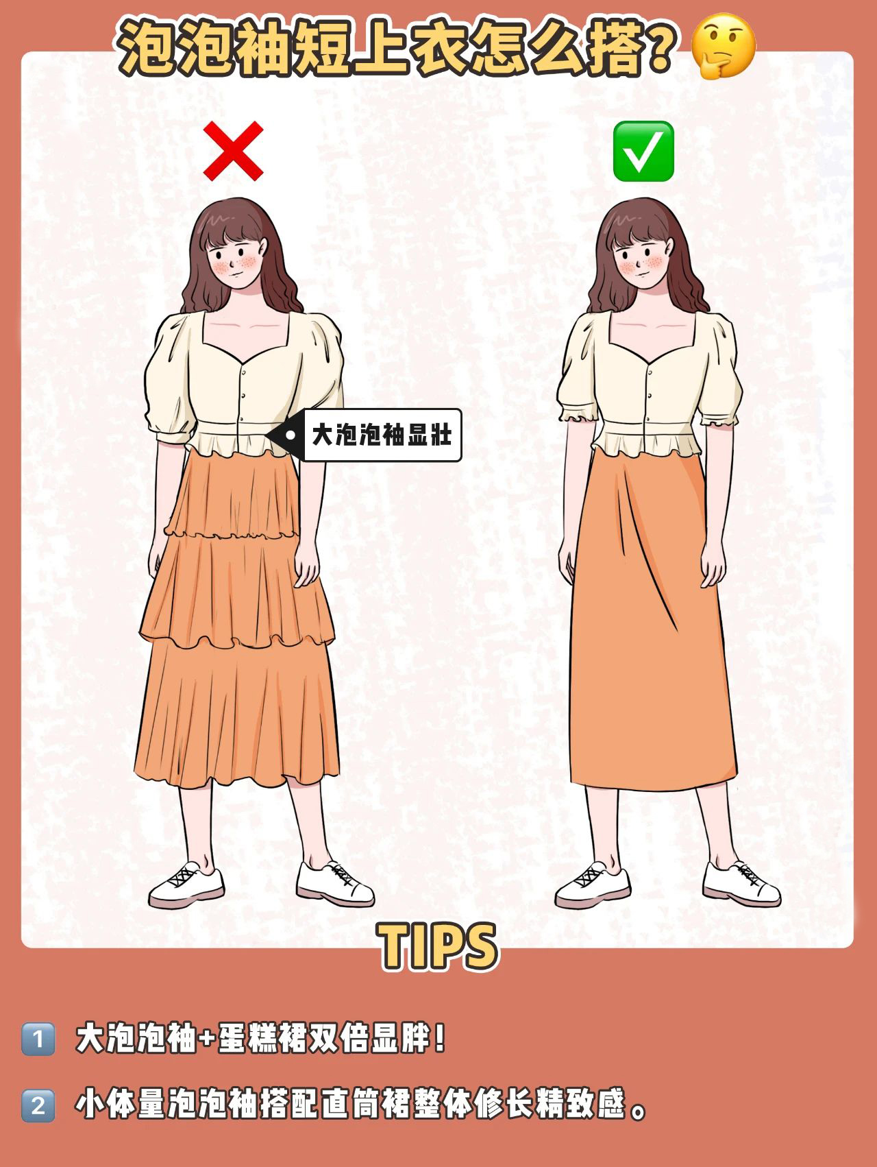 选择小体量泡泡袖,搭配简洁修身的半裙,就能避免给人“壮士”的感觉。