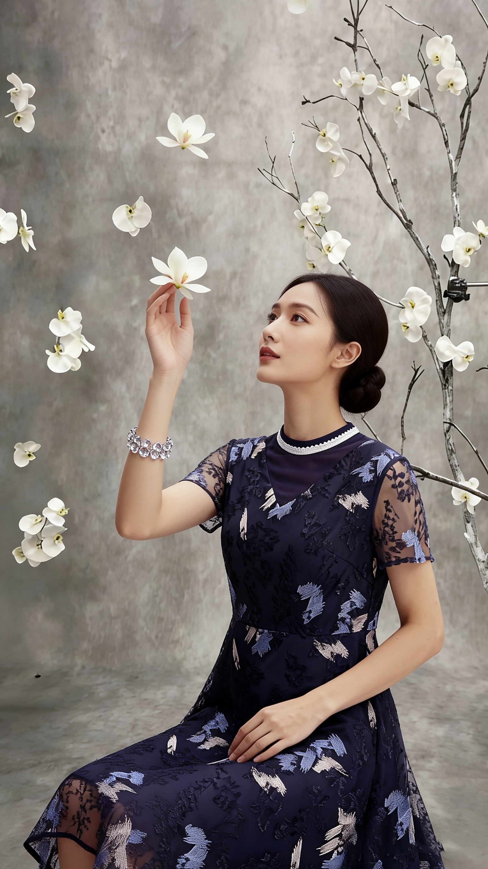 水墨灰调的静谧空间里,白兰清隽浮动,与衣身肌理遥遥相映。以藏青为画布,重工银丝线为笔,在通透网纱之上晕染文创写意刺绣,明暗流转间,尽显大牌级工艺质感。