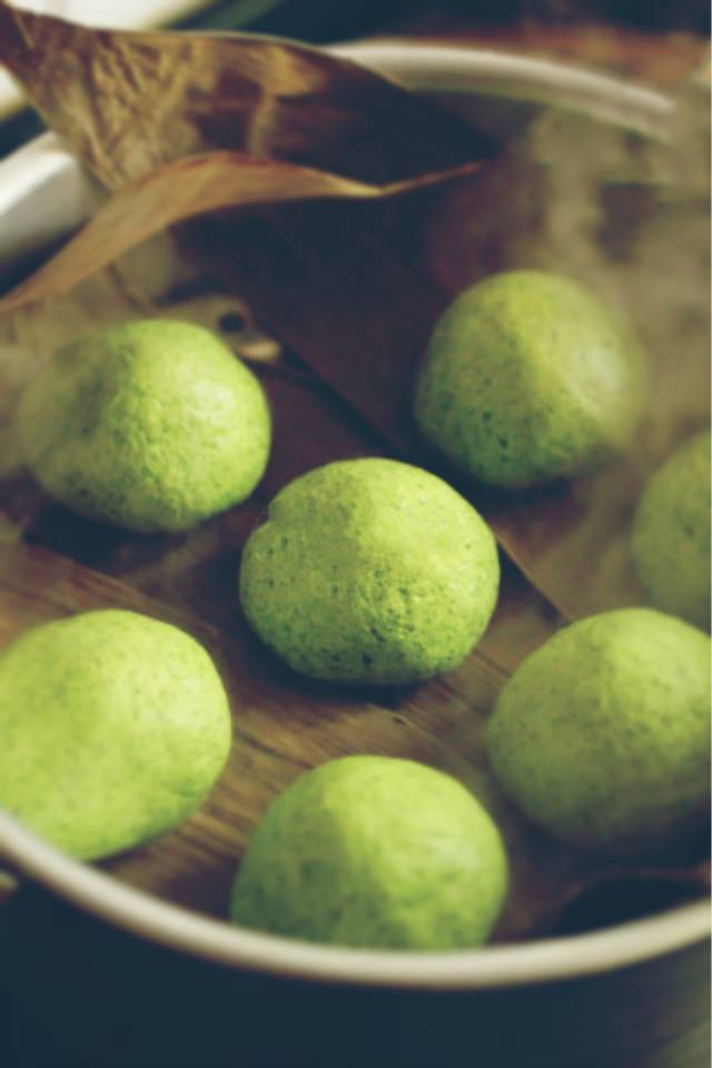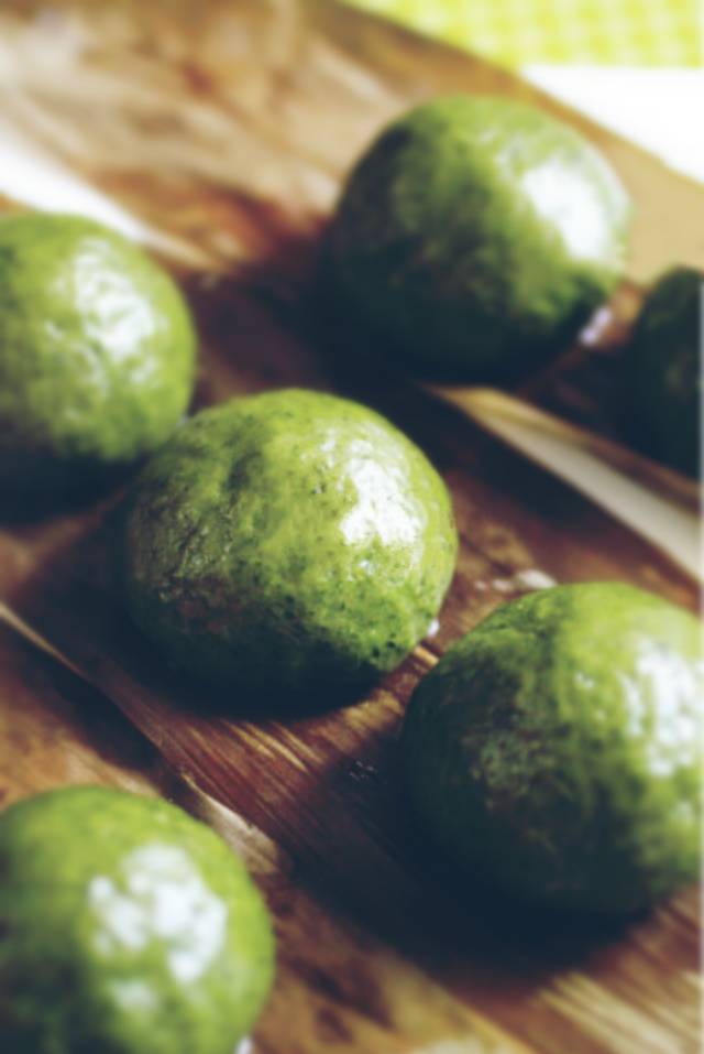 4、蒸锅放水,大火烧开,放入青团坯子,表面最好刷层油,防止干裂,改中火蒸15~20分钟;