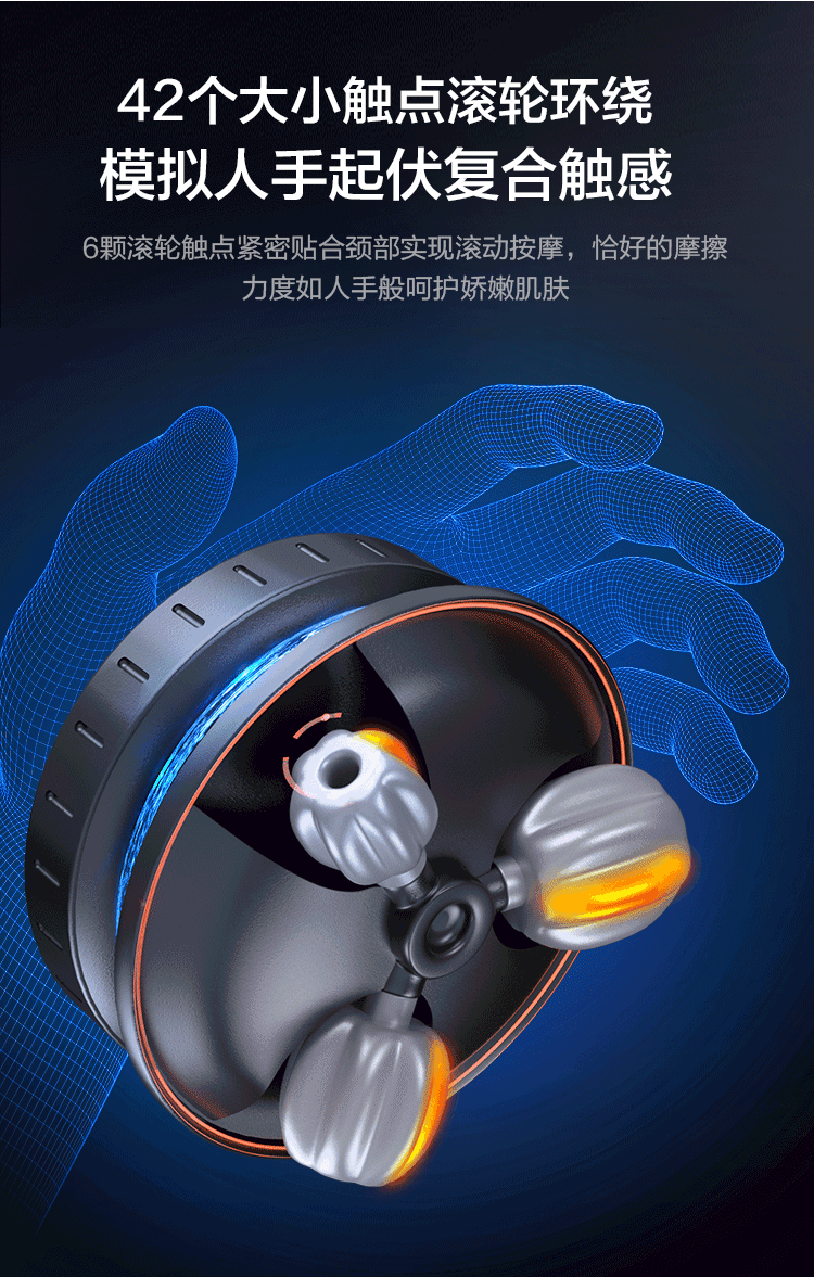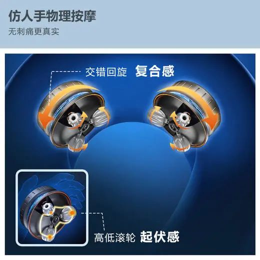 在转动运作的时候紧贴颈部,伴随按摩盘转动自动回旋,实现滚轮环绕,模拟人手起伏复合触感。