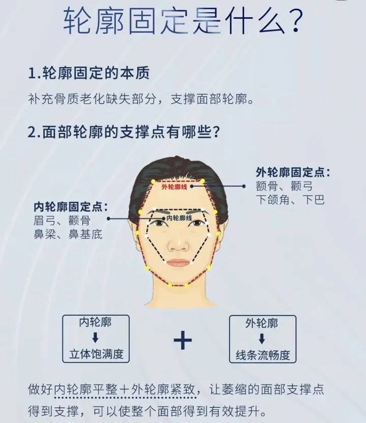 轮廓固定是一种高阶的全面部、全层次的综合性轮廓形态修饰,不仅有底层的填充逻辑,还涉及到韧带支撑、轮廓提升、内外轮廓协调等。