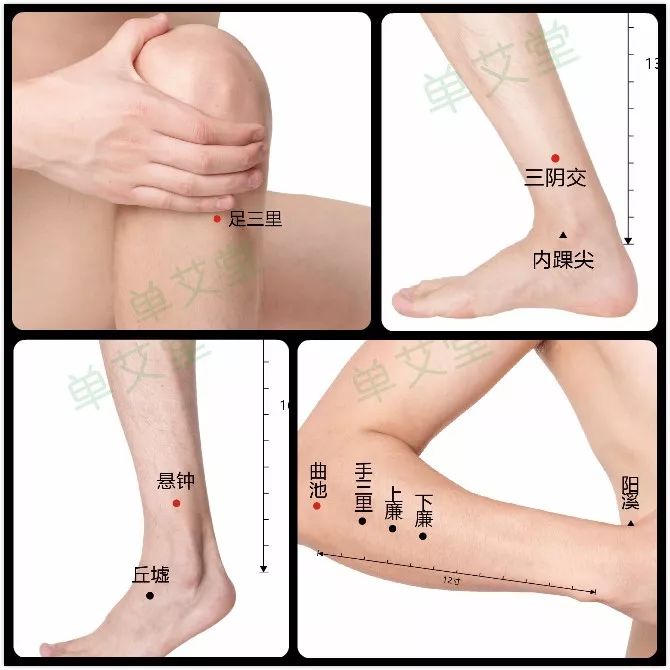 软化血管特效穴位:足三里穴、曲池穴、悬钟穴、三阴交穴。