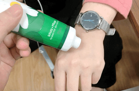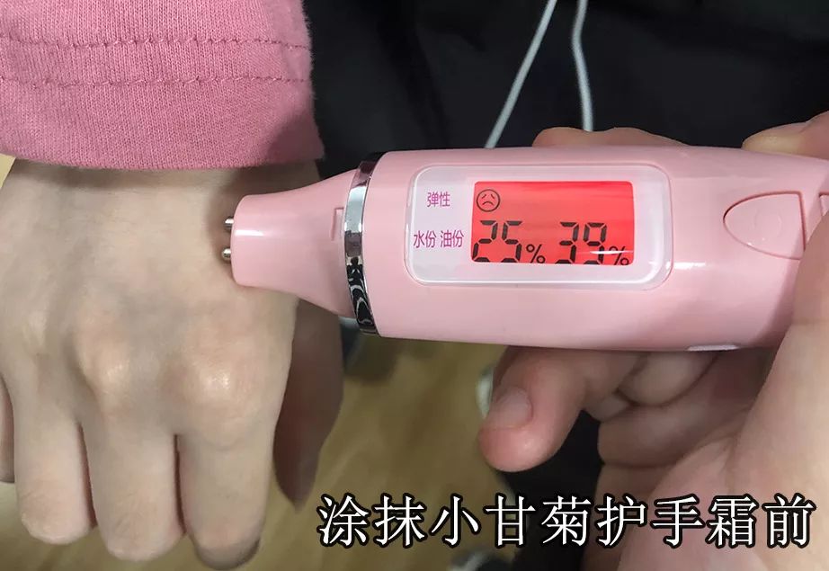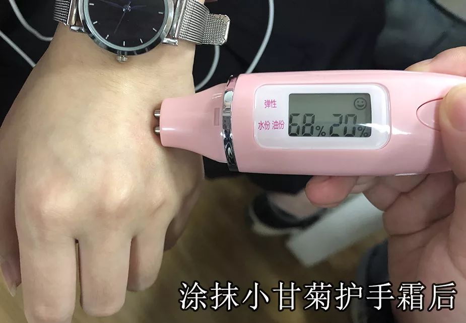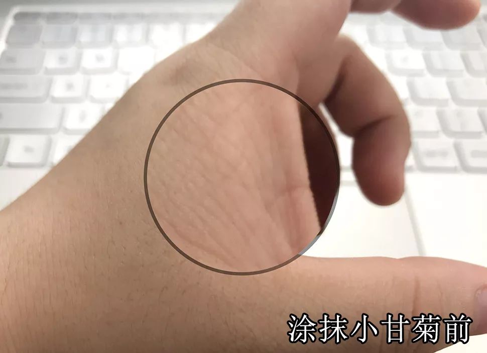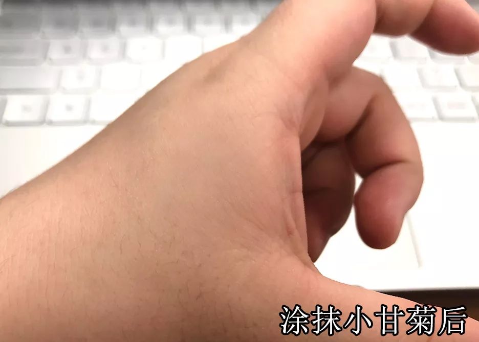 右手是没有涂过护手霜的,左右(戴手表)的是涂抹了小甘菊护手霜的。