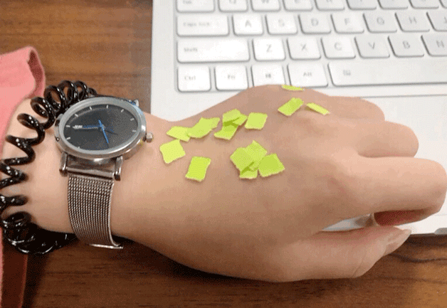 我们专门做了个小测试,在涂完小甘菊的手上,撒上纸屑,一吹就吹跑啦,清爽无负担~