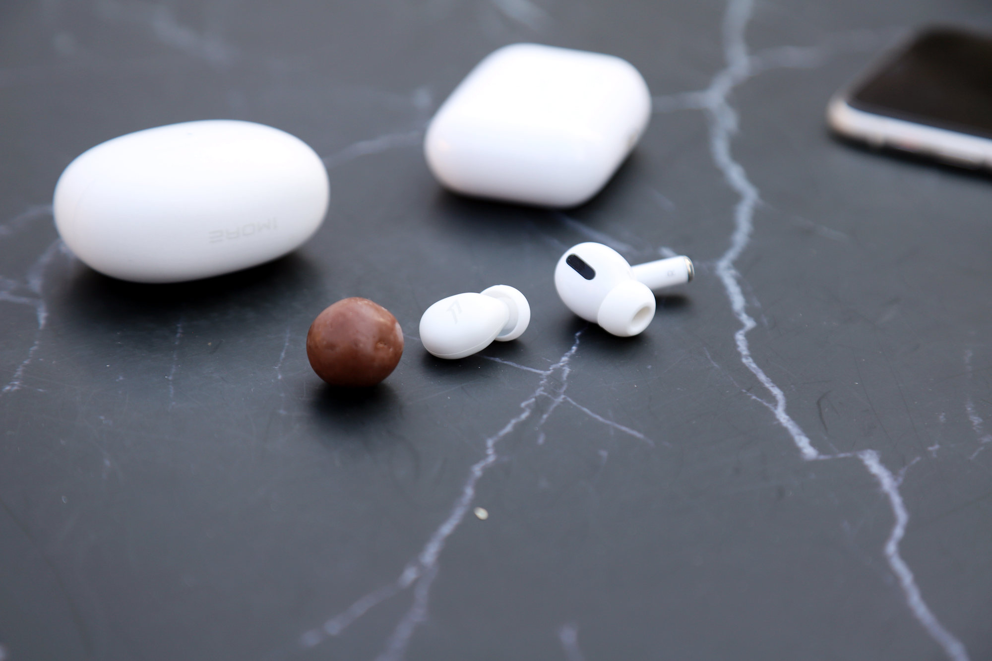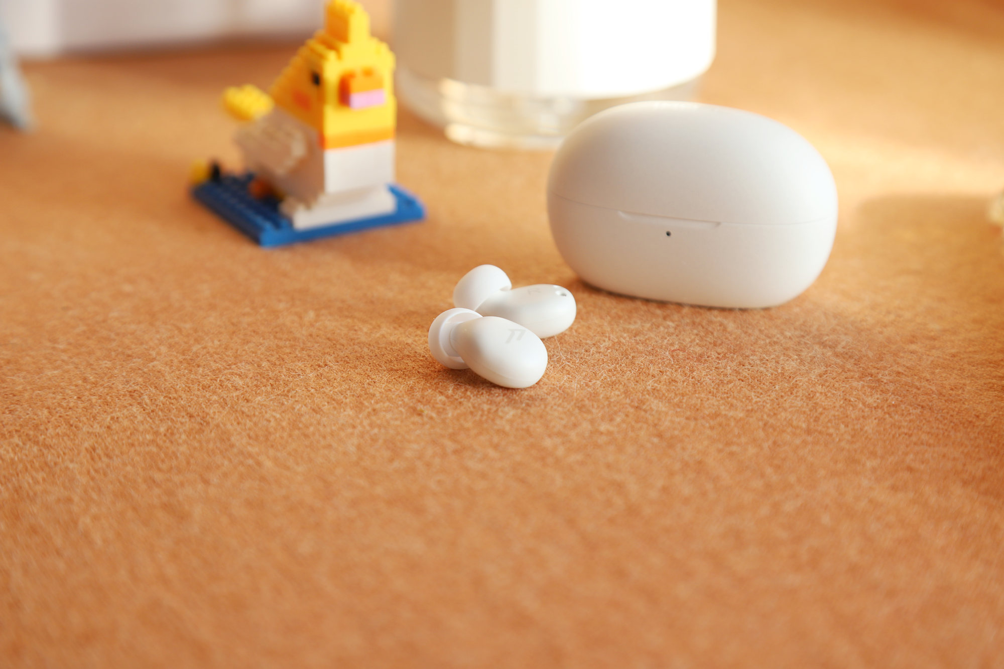 打开充电盒就可以看到2个小巧的睡眠豆了,第一眼便看到耳塞本体并没有设计耳翼组件儿,显得更加简单了一些,耳塞整体造型呈现一种椭圆形的样子,拿在手里十分轻巧。参数上单耳机重量2.7g,是真的很轻盈,耳机尺寸为24*9.2*14.2mm,大家可以找下身边的零食糖豆比划比划,我比划的是麦丽素和苹果耳机。