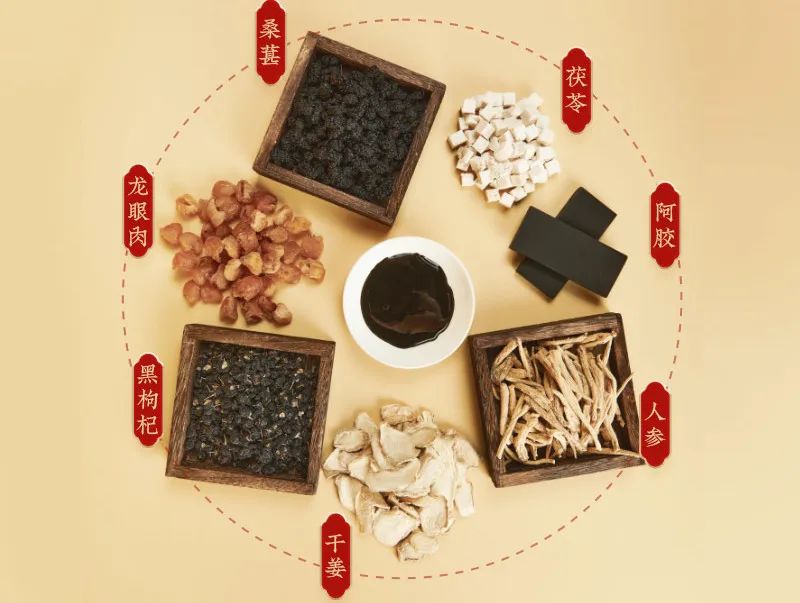 阿胶膏的配方包括:阿胶、黑枸杞、人参、桑椹、蜂蜜、干姜、龙眼肉和茯苓共计八味。