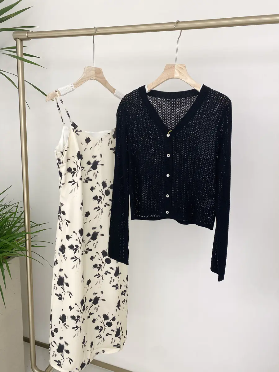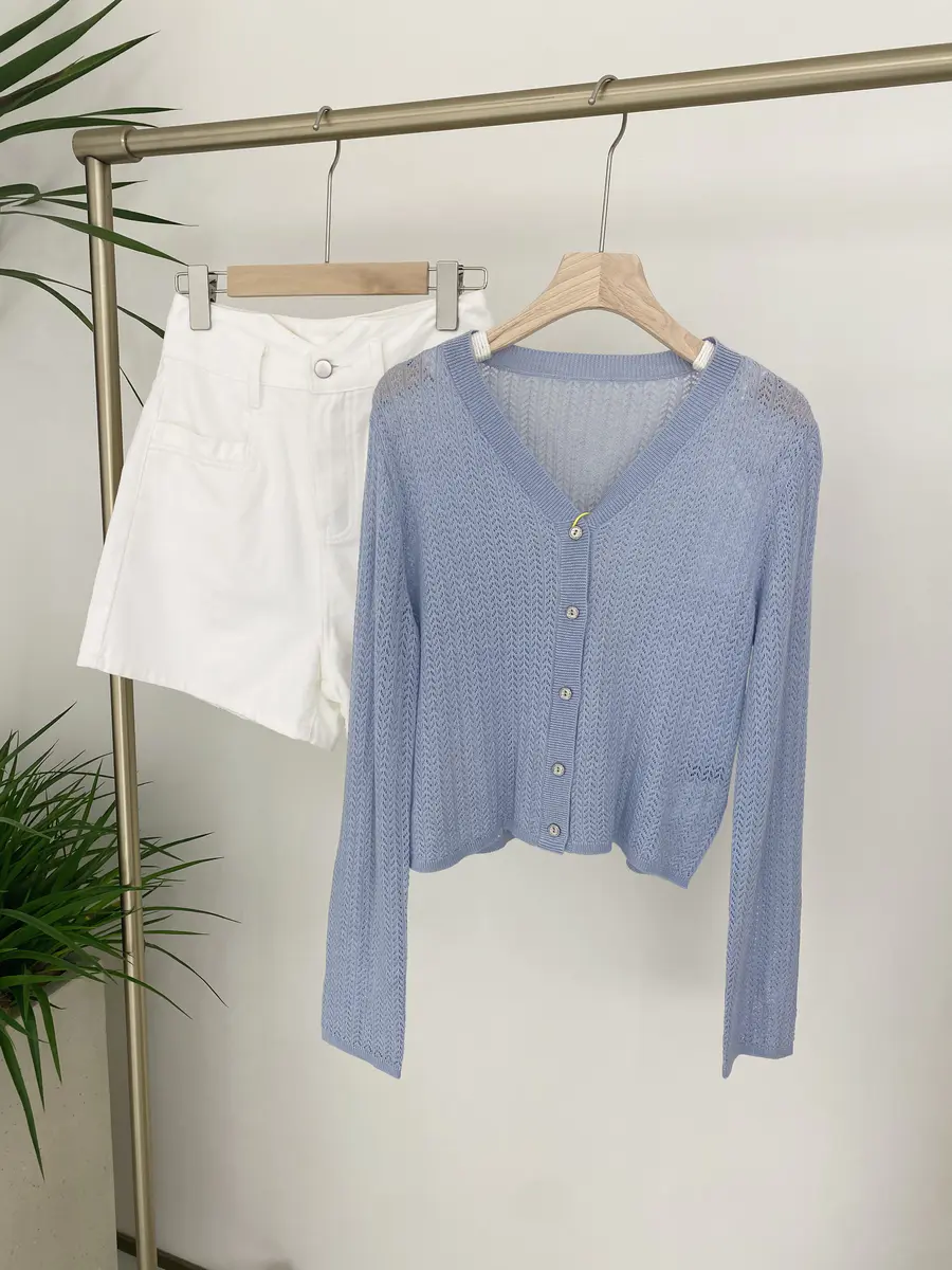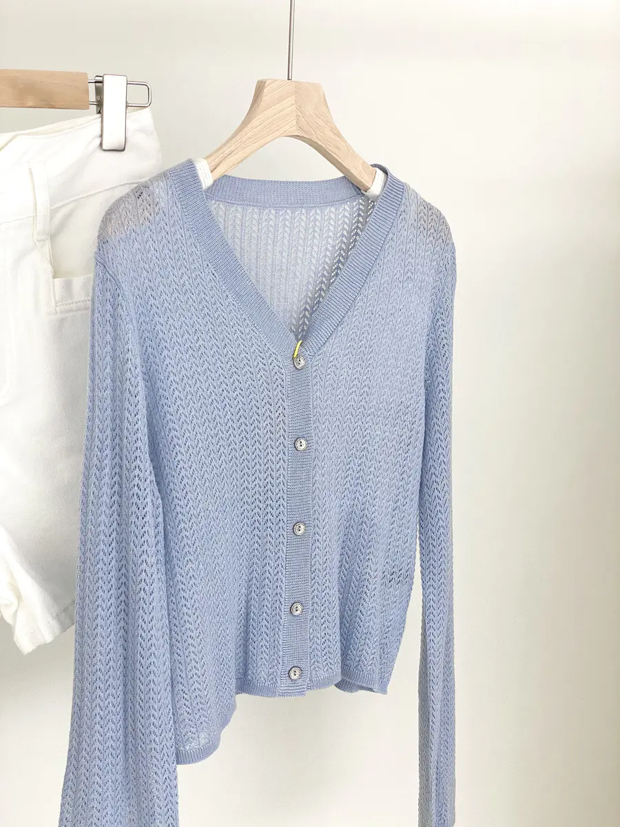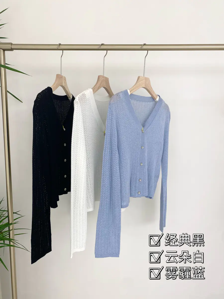 超推荐怕冷星人入手的针织开衫,含有5.6%桑蚕丝,亲肤感极强,结合镂空针织工艺,贴肤都是有点凉爽感;