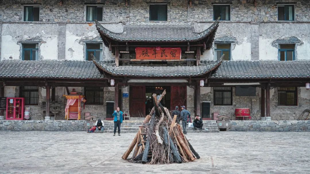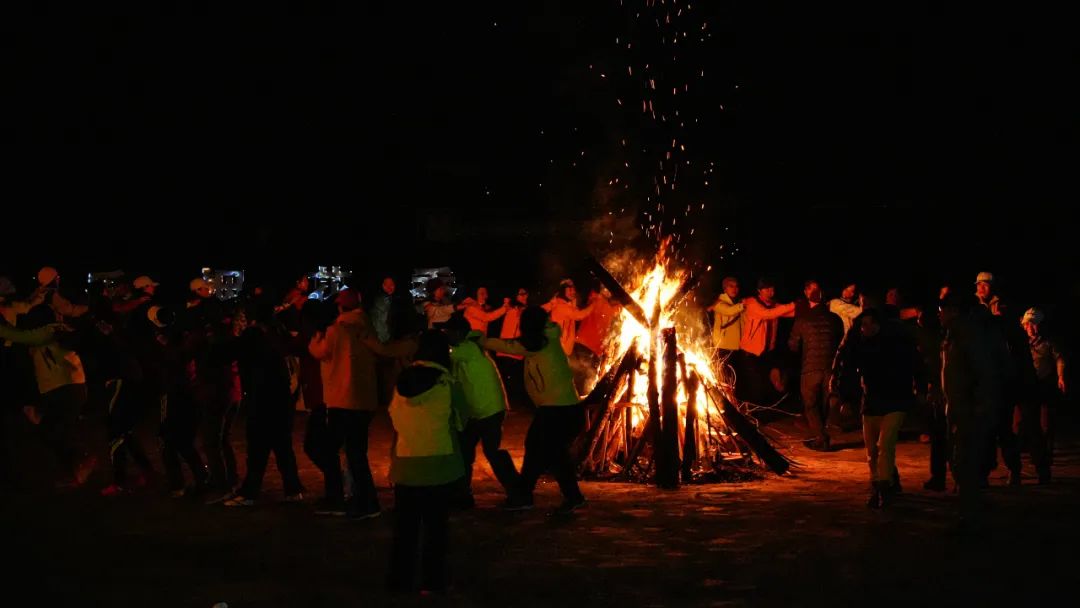 晚上,万籁静寂,我们在民宿门口的广场上燃起篝火、烟花,大家在围火成圈,一起做起游戏、跳起兔子舞。