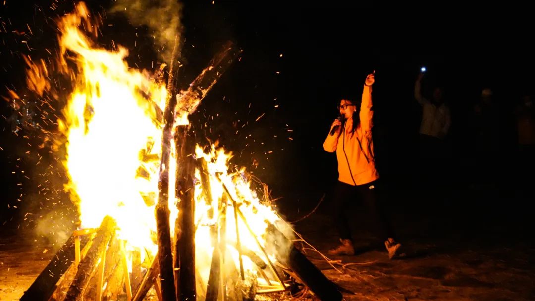 篝火晚会还在进行,主持人问有没有人愿意出来唱歌,当我觉得这也太社死了的时候,一个外向的小姐姐毫不犹豫的冲出人群,拿起话筒,又唱又跳。在火光的映照下,她如烟花般绚烂。
