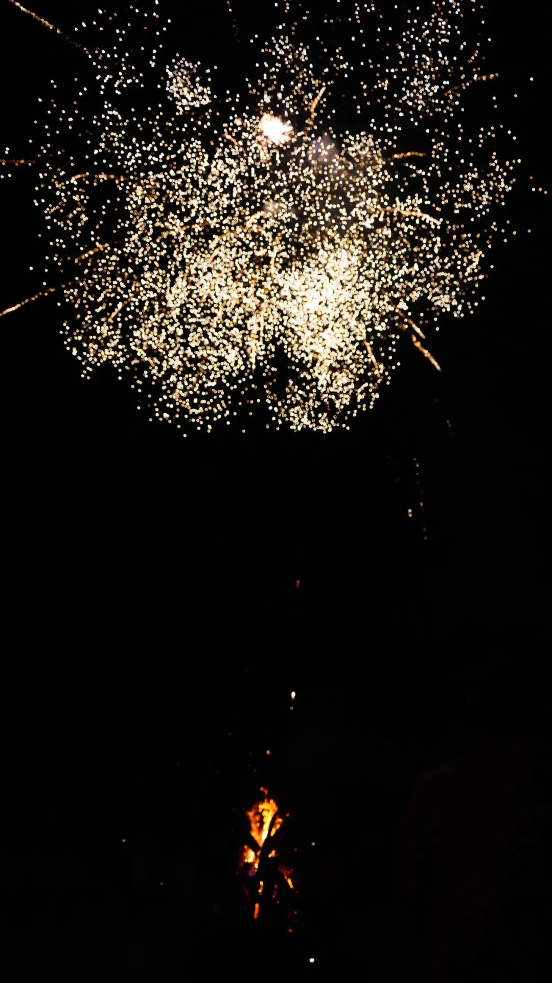 忽然间,烟花在篝火上绽放,如宇宙绚烂多彩。