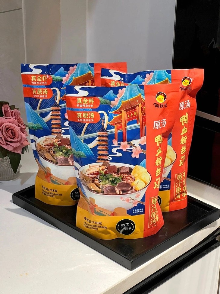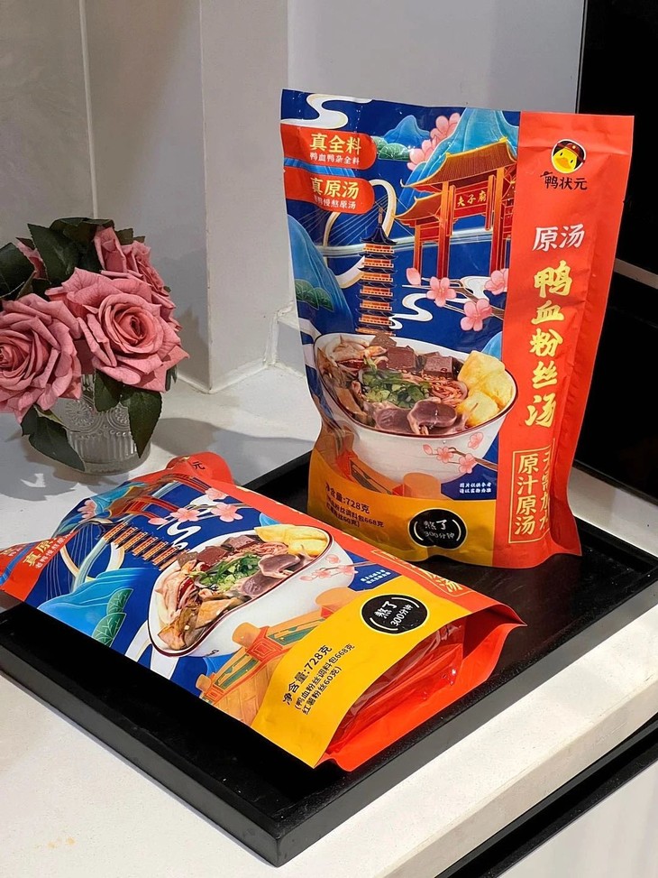 口味正宗,真材实料,份量充足。内含90克卤制鸭血鸭杂,鸭肠、鸭肝、鸭心全料,加上熬制老卤,不用外卖,只需开水冲泡5分钟,即可获得一碗媲美门店现做,暖心暖胃的南京鸭血粉丝汤!
