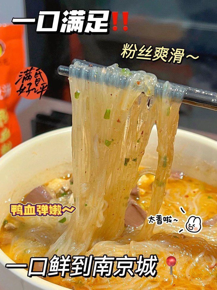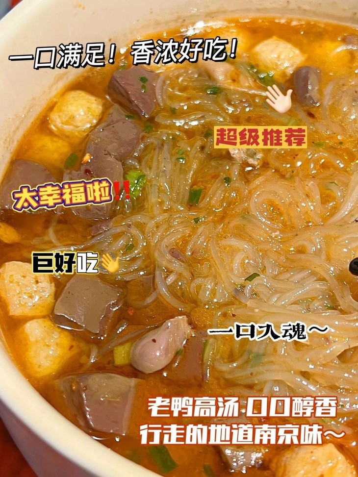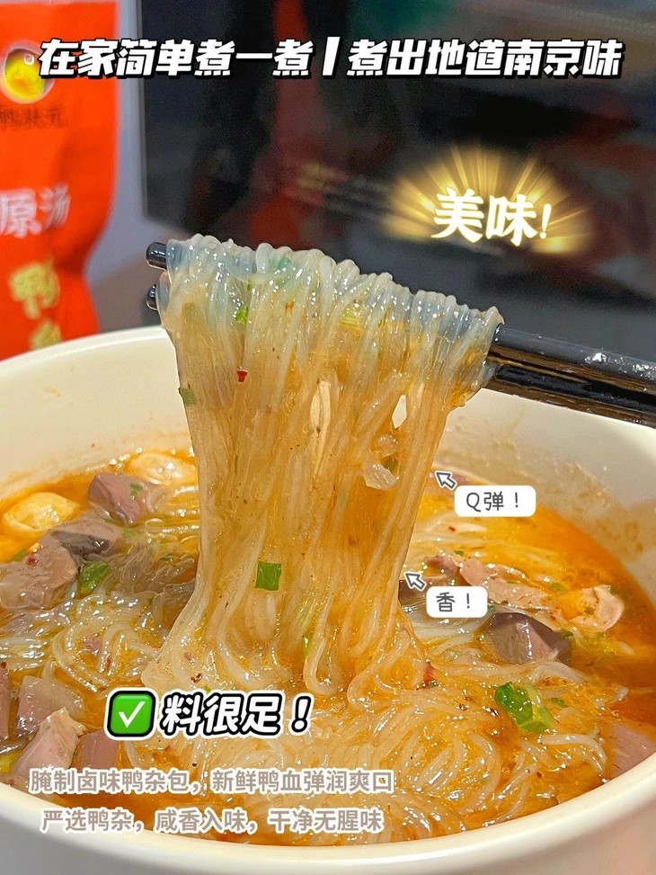 产品亮点:著名南京美食, 严选红薯粉丝,豆泡、鸭血鸭杂全料鸭血粉丝汤,极致还原餐厅味道。