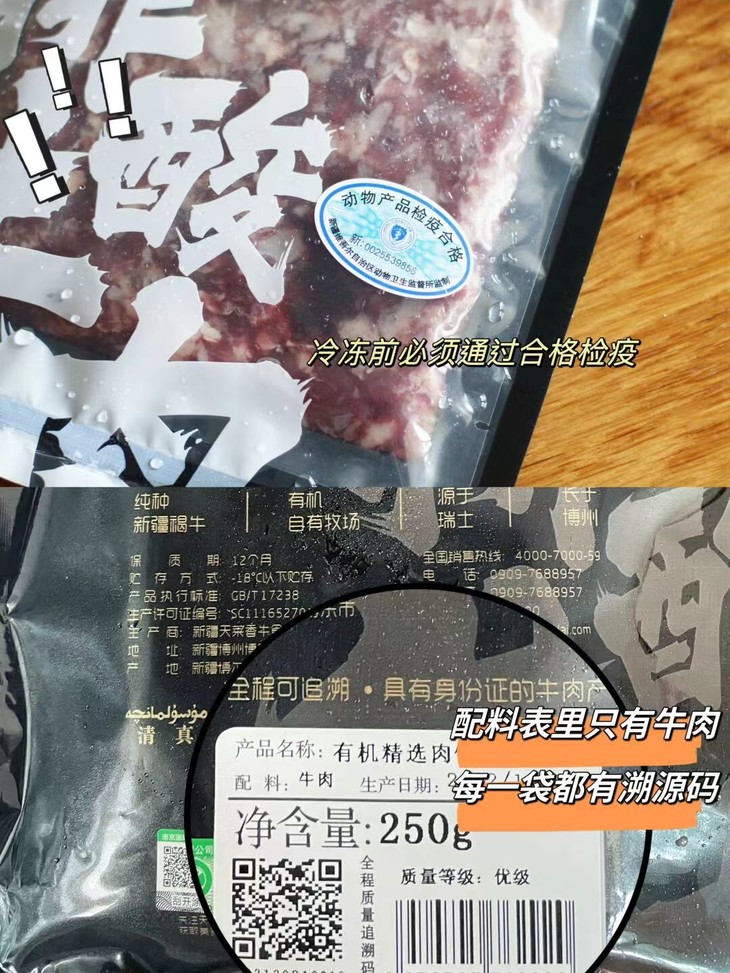 妈妈说,选择好的牛肉是牛肉馅成功的关键。👍一定要选择安全健康的牛肉,尽量选择有机牛肉给孩子吃~👀所以这次我买了天莱香牛有机牛肉馅,产自新疆,自种有机谷草,自养有机牛,365天有机谷饲喂养,100%有机牛肉制成~煎出来有纯纯的牛油香气,还带一点奶香,尤其适合做锅贴或者是做汉堡~