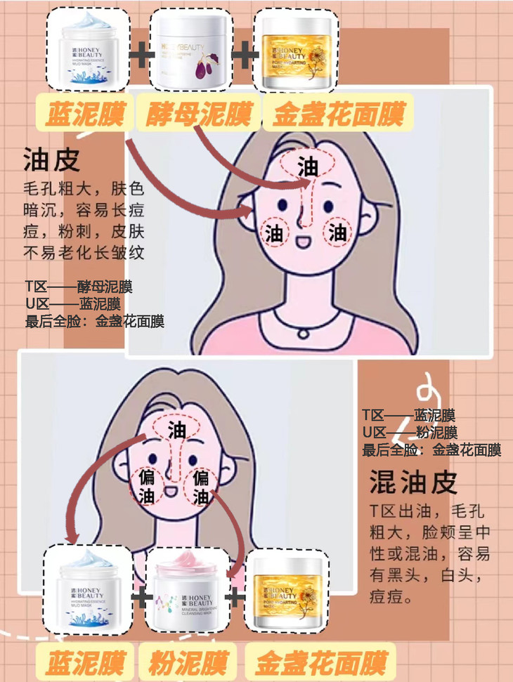 ✔️出油T区用蓝泥膜+较干部位U区用粉泥膜,最后用玫瑰面膜进行全脸补水保湿嫩肤