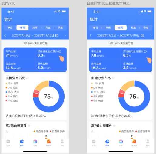 进入欧态健康App 「统计」页,切换日期,就能查看单日、单周、双周、月度甚至季度的预估糖化血红蛋白数值!