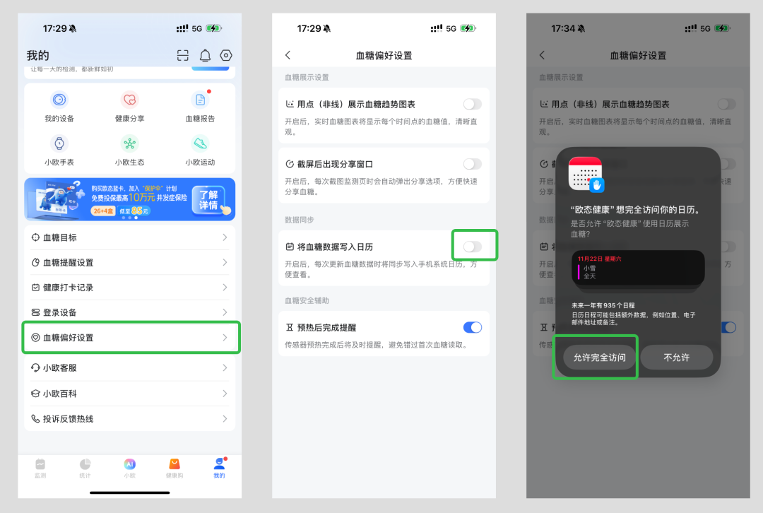 打开欧态健康 App —— “我的”页 —— 下滑动找到【血糖偏好设置】 —— 开启 “将血糖数据写入日历”,授权访问日历
