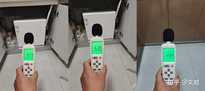 环境底噪是37分贝、启动冲洗后最大噪音是53分贝、关上柜门是44分贝。